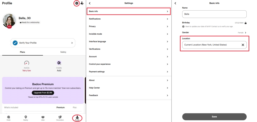 إذا لم تتمكن من تغيير موقعك باستخدام الطرق اليدوية، فكر في الترقية إلى Badoo Premium لمزيد من التحكم في إعدادات ملفك الشخصي.