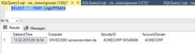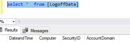 INSERT INTO LogoffData SELECT DATEANDTIME,COMPUTER,NULL, NULL FROM #FINALDATA GROUP BY DATEANDTIME,COMPUTER,LOGNUMBER UPDATE LogoffData SET SECURITYID= B.[DATA] FROM #FINALDATA B WHERE B.TITLE LIKE '%SECURITY ID%'AND B.LOGNUMBER =4 UPDATE LogoffData SET [ACCOUNTDOMAIN]= B.[DATA] FROM #FINALDATA B WHERE B.TITLE LIKE '%ACCOUNT DOMAIN%'AND B.LOGNUMBER =4 SELECT * FROM LogoffData