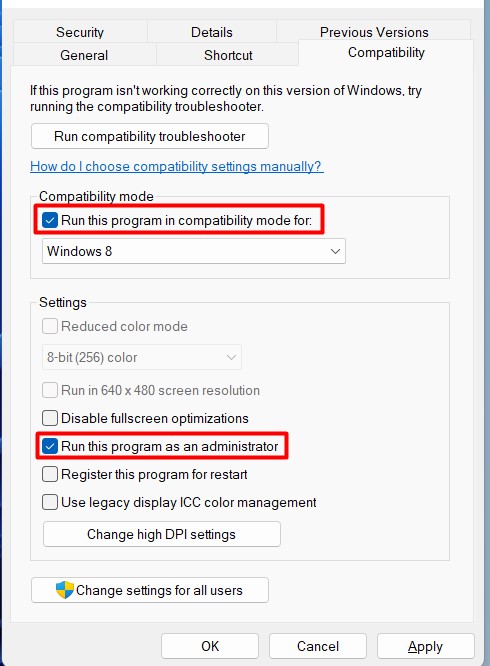 الخطوة 4:وبالمثل، حدد "قم بتشغيل هذا البرنامج في وضع التوافق لـ.”