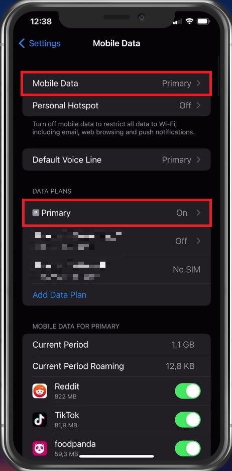 قد تتسبب بعض إعدادات iPhone في حدوث خطأ في تنشيط iMessage وFaceTime. أولاً، افتح تطبيق الإعدادات الخاص بك. تحتبيانات الجوال، تأكد من تمكين بيانات الجوال لبطاقة SIM الأساسية لديك.