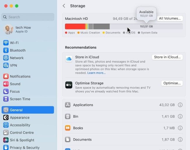 فيعامالقسم، انقر علىتخزين. هنا، تأكد من أن لديك مساحة تخزين كافية لتنزيل ملفاتك. يمكنك اتباع توصيات التخزين، مثل إفراغ سلة المهملات أو السماح لجهاز Mac بتحسين مساحة التخزين لديك لتحرير بعض المساحة تلقائيًا.