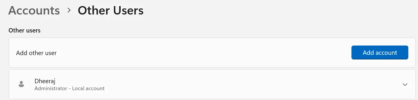 3. ثم، ضمن "مستخدمون آخرون"، انقر فوق خيار "إضافة حساب".