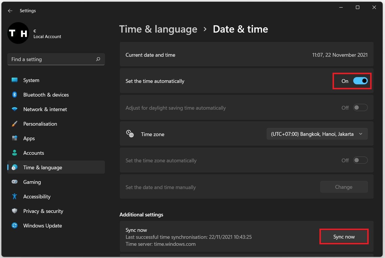 انقر بزر الماوس الأيمن فوق التاريخ والوقت في قائمة البداية وحددضبط الوقت والتاريخ. سيتم فتح نافذة الإعدادات الخاصة بك وتمكيناضبط الوقت تلقائيًاخيار. تحتإعدادات إضافية، انقر علىمزامنة الآن. سيضمن هذا صحة إعدادات الوقت والتاريخ، مما يمكنه إصلاح خطأ Minecraft Launcher غير المتاح حاليًا في حسابك من متجر Microsoft.