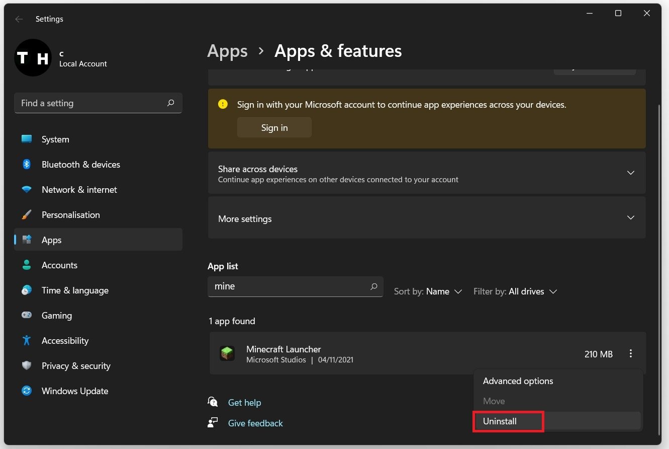تأكد من إلغاء تثبيت مشغل Minecraft السابق. بحث عنإلغاء التثبيتأوتطبيقاتفي قائمة البداية أو البحث في شريط المهام للعثور علىالتطبيقات والميزاتنافذة إعدادات النظام. سترى قائمة كاملة بالتطبيقات المثبتة على نظامك. تأكد من تصفية القائمة حسب جميع محركات الأقراص والبحث عن Minecraft للعثور على محرك الأقراص الخاص بكماين كرافت قاذفةطلب. انقر على قائمة البرجر الموجودة على الجانب الأيمن واخترإلغاء التثبيت. ستستغرق عملية إلغاء تثبيت مشغل Minecraft القديم من نظامك دقيقة واحدة.