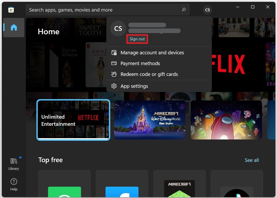 افتح متجر Microsoft الخاص بك من خلال البحث عنه في قائمة البحث في قائمة البداية. انقر على أيقونة حسابك لتسجيل الخروج من حساب Microsoft الخاص بك. ببساطة اخترتسجيل الخروج. عند الانتهاء من ذلك، تأكد من تسجيل الدخول مرة أخرى.