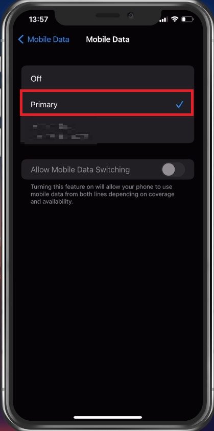 أولاً، افتح إعدادات iPhone الخاص بك. هنا، تحتبيانات الجوال، تأكد من تحديد بطاقة SIM الأساسية الخاصة بك.