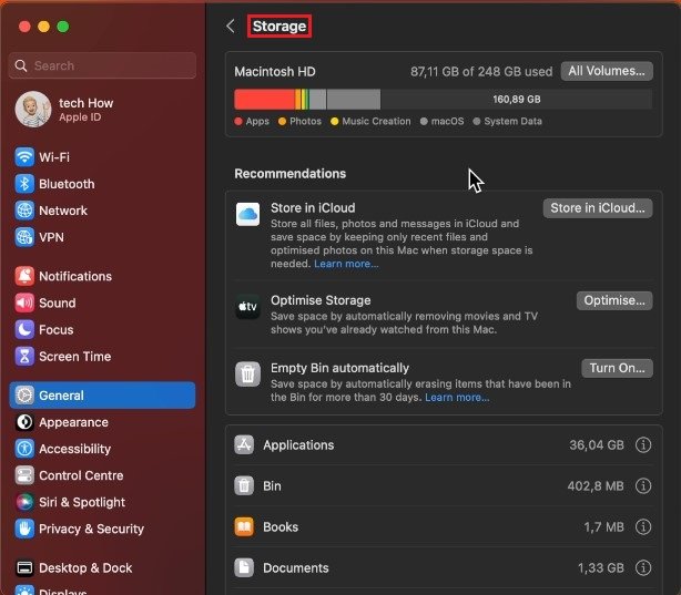 في بعض الحالات، لن يتم تشغيل Roblox بشكل صحيح ولن يتم تنزيل ملفات اللعبة إذا كانت مساحة تخزين جهاز Mac الخاص بك ممتلئة. في الخاص بكعامالإعدادات، انقر علىتخزين.