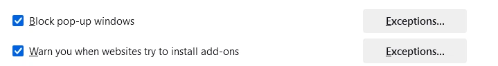 الخطوة 8: قم بالتمرير لأسفل إلى قسم الأذونات، وابحث عن “حظر النوافذ المنبثقة”، وانقر على “الاستثناءات”. تأكد من السماح لموقع الويب كاستثناء لإعداد حظر النوافذ المنبثقة.