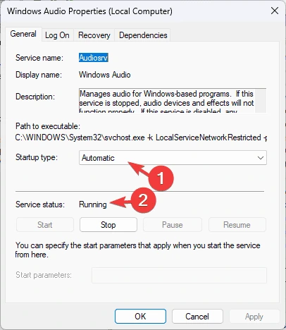 - خدمة صوت ويندوز: إذا لم تكن خدمة Windows Audio قيد التشغيل أو مضبوطة على الوضع اليدوي، فيمكن أن تمنع تشغيل الصوت.