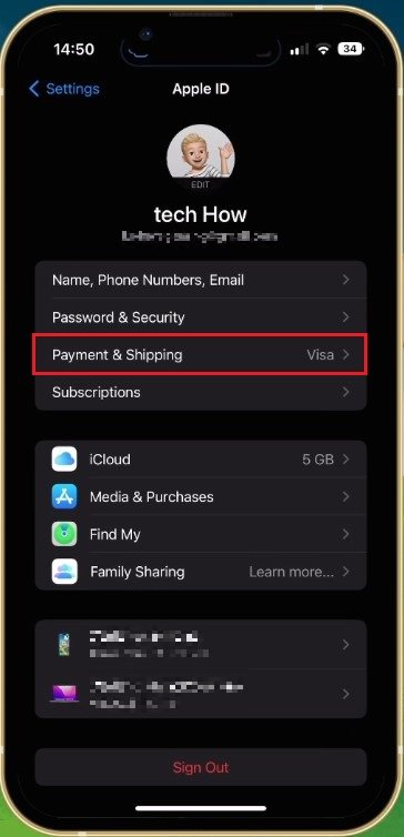 بعد ذلك، افتح إعدادات النظام لديك. اضغط على اسم معرف Apple الخاص بك، ومن هنا، حددالدفع والشحن. قد يُطلب منك تسجيل الدخول باستخدام حساب Apple ID الخاص بك قبل إجراء أي تغييرات على هذه الإعدادات.