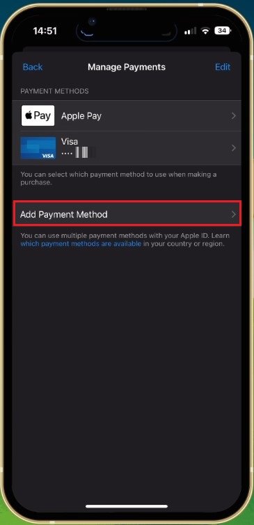 بعد ذلك، قم بإزالة طريقة الدفع الحالية إذا كنت تستخدم واحدة. على سبيل المثال، يمكنك إعادة إضافة نفس طريقة الدفع إذا لم تكن البطاقة منتهية الصلاحية. إذا استمرت المشكلة، فأضف طريقة دفع مختلفة، لأن الطريقة الحالية هي التي تسبب خطأ معرف Apple الذي تحصل عليه.