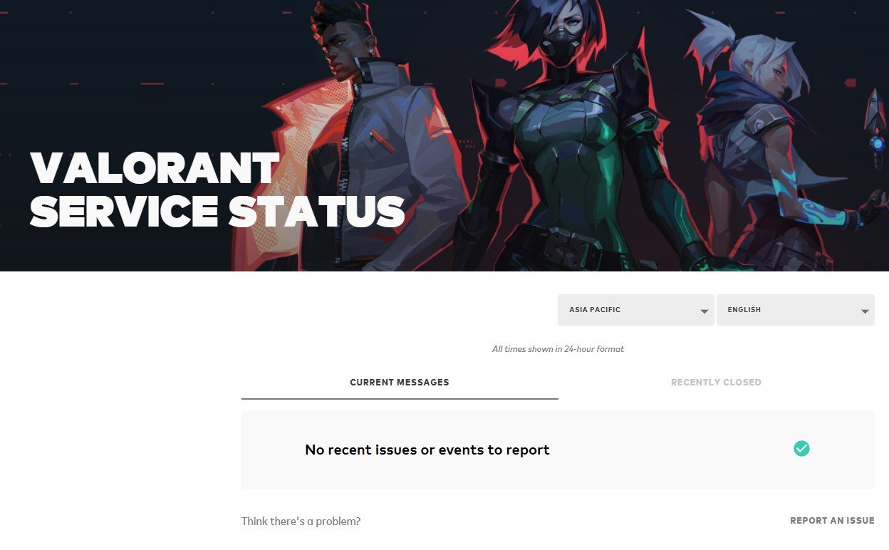 بعد ذلك، يجب عليك إلقاء نظرة سريعة على حالة خادم Valorant. انتقل إلىstatus.riotgames.comفي متصفحك المفضل حدد Valorant في قائمة الألعاب هذه، واختر منطقة الخادم ولغته. سيسمح لك هذا بمعرفة ما إذا كانت هناك أية مشكلات حالية في الخادم في منطقتك. قد يكون هذا جدولاً لصيانة الخادم أو انقطاعه.