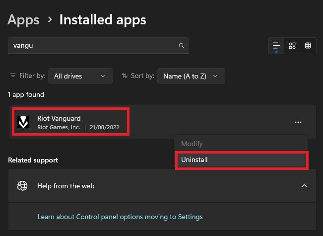 تأكد من تصفية بحثك حسب كافة محركات الأقراص ومتابعة البحثالطليعة. انقر على قائمة البرجر لـطليعة الشغبالبرنامج واختيارإلغاء التثبيت. قد يستغرق هذا بضع ثوانٍ قبل أن تتمكن من إعادة فتح برنامج Riot Client. سيشرع عميلك بعد ذلك في إعادة تنزيل Vanguard وإعادة تثبيته على نظامك. وقد ساعد هذا في إصلاح خطأ اتصال Valorant لمعظم المستخدمين.