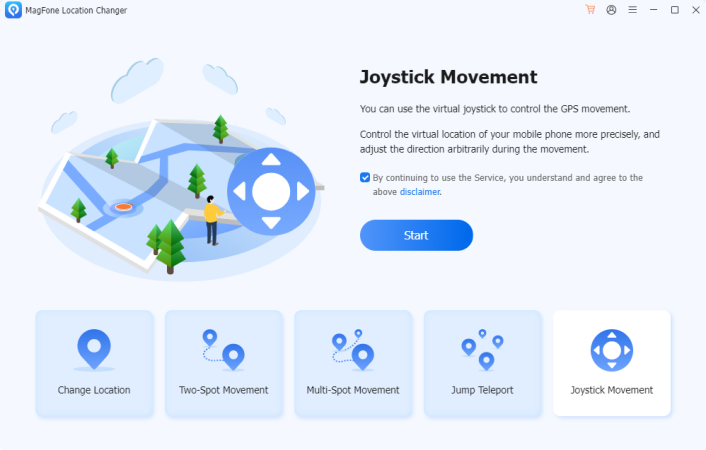 قم بتوصيل جهازك بالكمبيوتر عبر كابل USB، ثم قم بتشغيل MagFone Location Changer. على الواجهة الرئيسية للبرنامج، حدد خيار Joystick Movement وانقر فوق الزر Start.