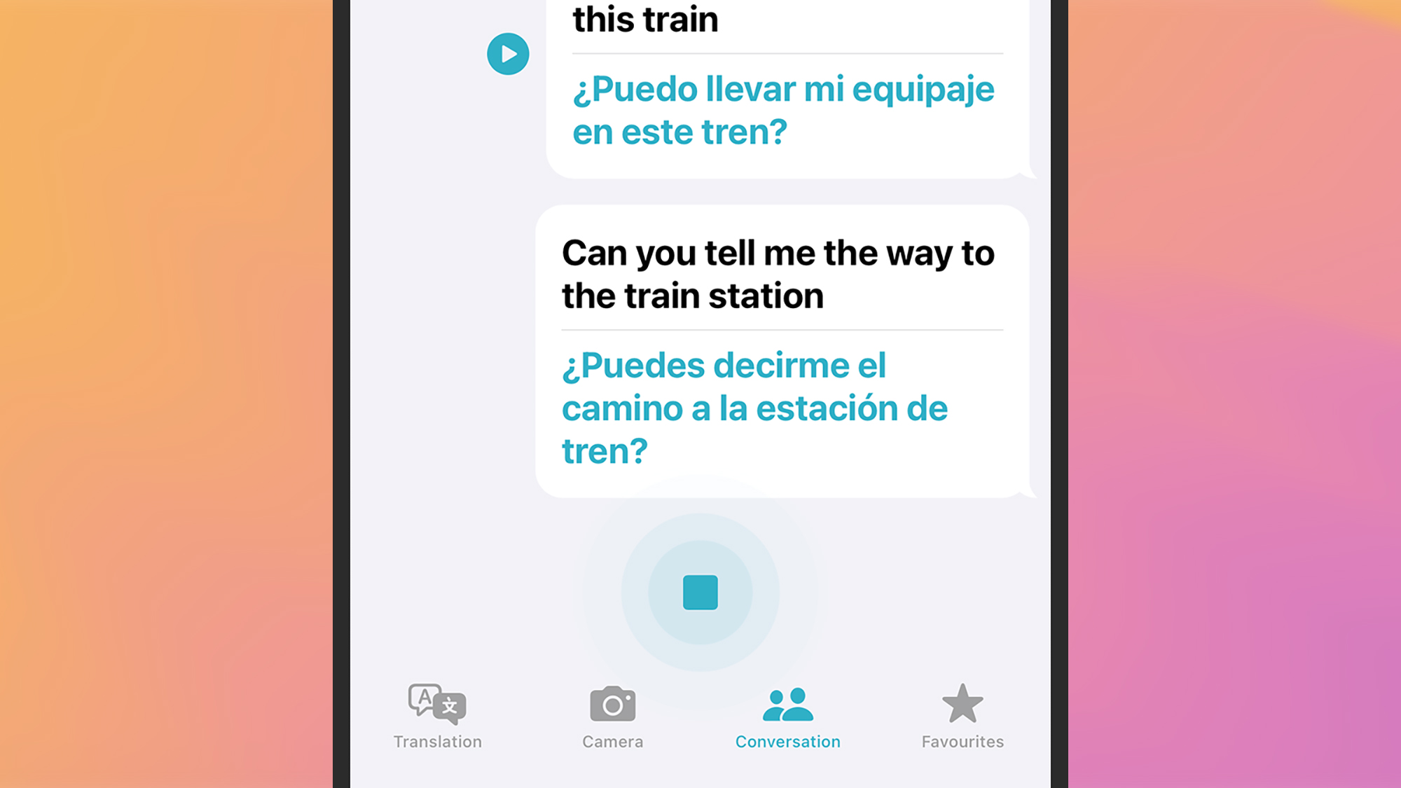 للدردشة في الوقت الفعلي بلغتين، انقر فوقمحادثةالموجود على شريط الأدوات بالأسفل، ثم اضغط على زر الميكروفون لبدء التحدث. بمجرد أن يستشعر التطبيق أنك قد انتهيت مما كنت تقوله، فإنه يعرض الترجمة على الشاشة: اضغط على زر التشغيل المجاور لها لقراءتها.