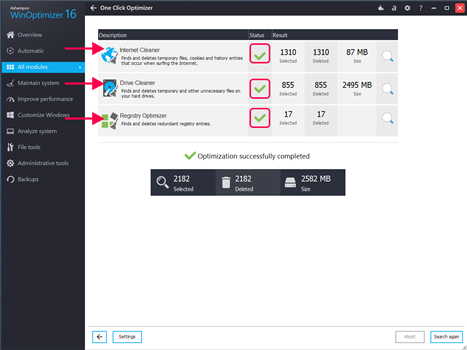 الخطوة 2: قم بتشغيل التطبيق وحدد جميع الوحدات متبوعًا بـ One Click Optimizer. يجب أن تسهل عليك الصورة التالية العثور على هذه الخيارات.