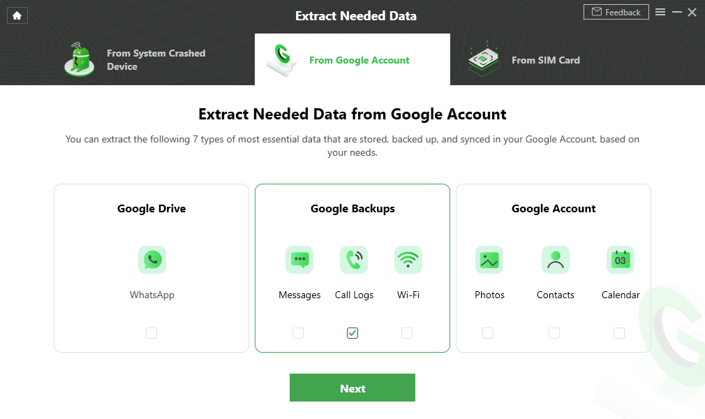 الخطوة 1. قم بتنزيل وتشغيل DroidKit. قم بتوصيل هاتفك إذا كنت بحاجة إلى استعادة سجلات المكالمات إلى جهازك. يختارمن حساب جوجلفي مستخرج البيانات