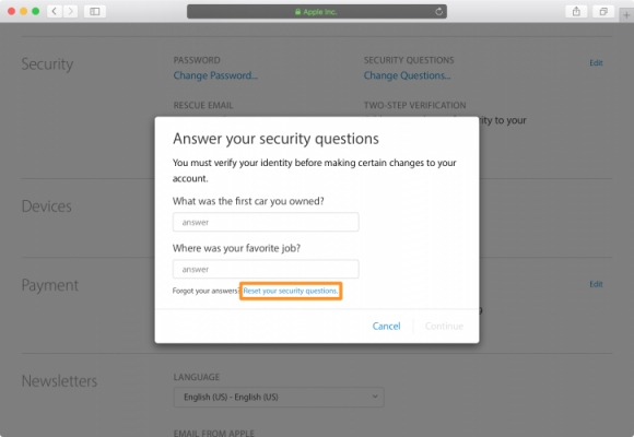 الخيار 2. إعادة تعيين أسئلة أمان معرف Apple على الويب