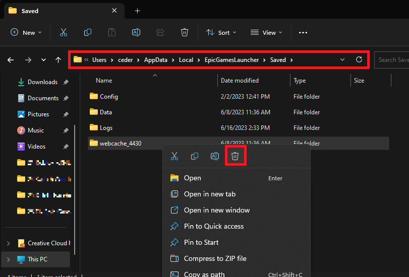 لتصحيح خطأ Epic Games "IS-0003"، فإن إزالة مجلد Webcache هي الخطوة الحاسمة التالية. للبدء، استخدم البحث في قائمة البداية للعثور على "%localappdata%"، ثم اضغط على إدخال. يؤدي هذا الإجراء إلى إظهار مستكشف الملفات الخاص بك. في نافذة المستكشف، حدد مجلد "Epic Games Launcher" وقم بالوصول إليه. ضمن هذا المجلد، حدد موقع المجلد "المحفوظ" وافتحه. داخل المجلد "المحفوظ"، حدد مجلد "webcache". يعد حذف هذا المجلد أمرًا ضروريًا في عملية الحل. لا تنس إزالة المجلدين "webcache_4147" و"webcache_4430" أيضًا، إذا واجهتهما في الدليل.