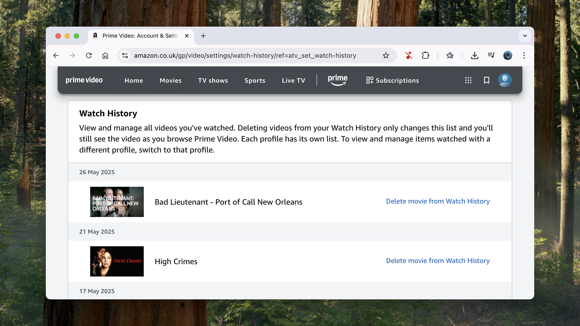 بجوار أي شيء تريد إزالته من سجل مشاهدة Prime Video، انقر فوقحذف الفيلم من سجل المشاهدةأوحذف الحلقات من سجل المشاهدة. لسوء الحظ، لا يوجد خيار الحذف المجمع، لذلك قد يستغرق هذا بعض الوقت.