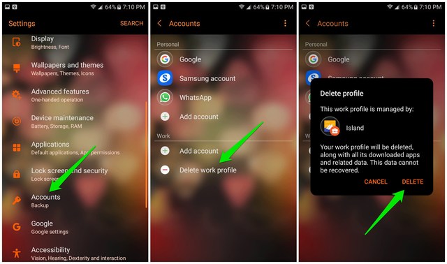 نظرًا لأن Island يستخدم الملفات الشخصية المُدارة لإنشاء ملفات شخصية للعمل، فإن إلغاء تثبيت Island لن يكون كافيًا. لإلغاء تثبيت Island بالكامل، قم أولاً بإلغاء تثبيته بالطريقة العادية ثم انتقل إلى"إعدادات"واضغط على"الحسابات". هنا اضغط على"حذف الملف الشخصي للعمل"ثم قم بتأكيد المطالبة بحذف كافة البيانات.