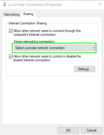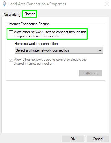 - انقر فوق "مشاركةعلامة التبويب "وتمكين"السماح لمستخدمي الشبكة الآخرين بالاتصال عبر اتصال الإنترنت الخاص بهذا الكمبيوتر" خيار.