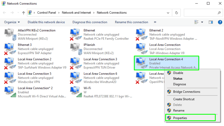 - انقر بزر الماوس الأيمن فوق اتصال الشبكة باستخداممحول شبكة الوصول إلى الإنترنت الخاصوحددملكيات.