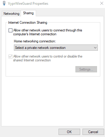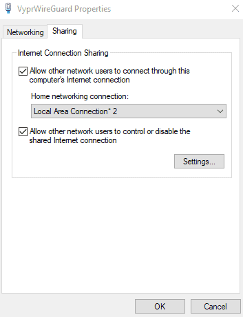 - ستظهر لك نافذة منبثقة تعلمك بأنك على وشك تمكين مشاركة الإنترنت على اتصال VyprVPN الخاص بك. انقرنعم.