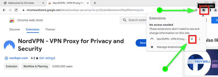 - بمجرد إضافتها، انقر فوقملحقات كرومورمز الدبوسبجوار NordVPN. وهذا يضمن أنه سيكون لديك دائمًا إمكانية الوصول المباشر إلى الامتداد.