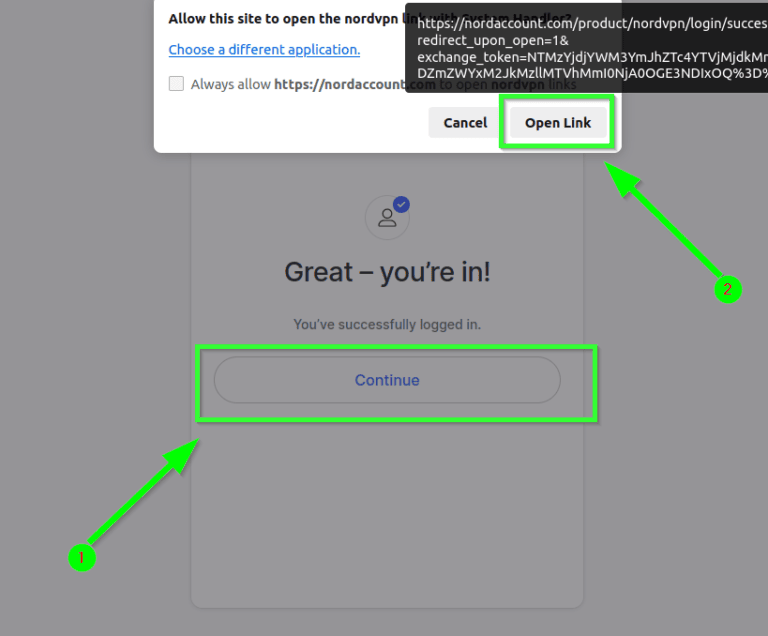 - انقر فوق "يكمل،" ثم "افتح الرابط" في نافذة المتصفح التي تظهر. يؤدي ذلك إلى تشغيل جهازك الطرفي، حيث تقوم بتشغيل تطبيق NordVPN.