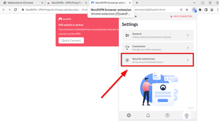 - انقر فوق ملحق NordVPN مرة أخرى. اذهب من خلالإعدادات>الأمن والخصوصية.