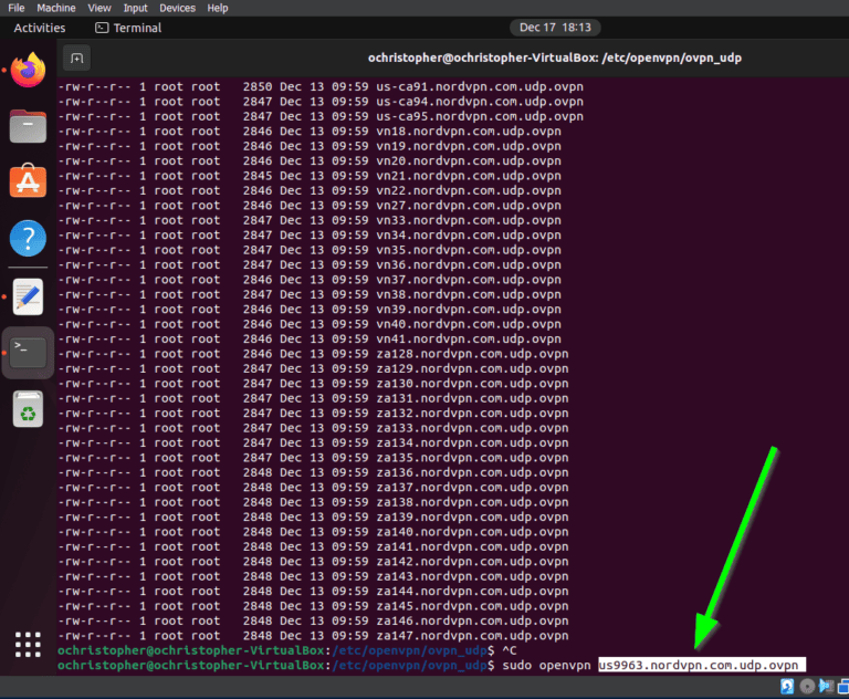 - قم بتشغيل الدليل حيث تم تفكيك خوادم NordVPN OpenVPN. يمكنك تشغيل الأوامر أدناه للحصول على خوادم OpenVPN UDP (الأسرع) أو TCP (الأكثر استقرارًا).