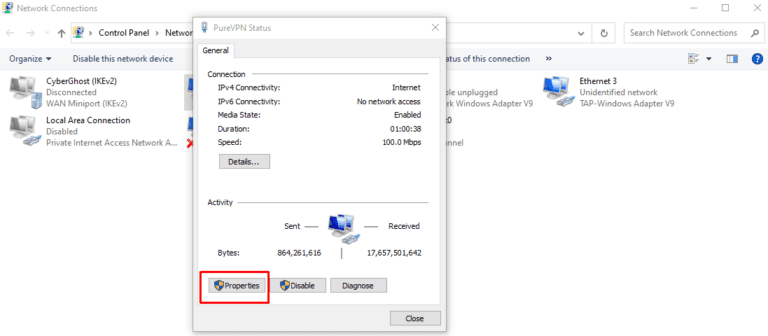 الخطوة 5:انقر بزر الماوس الأيمن على اتصال PureVPN وحددملكيات.
