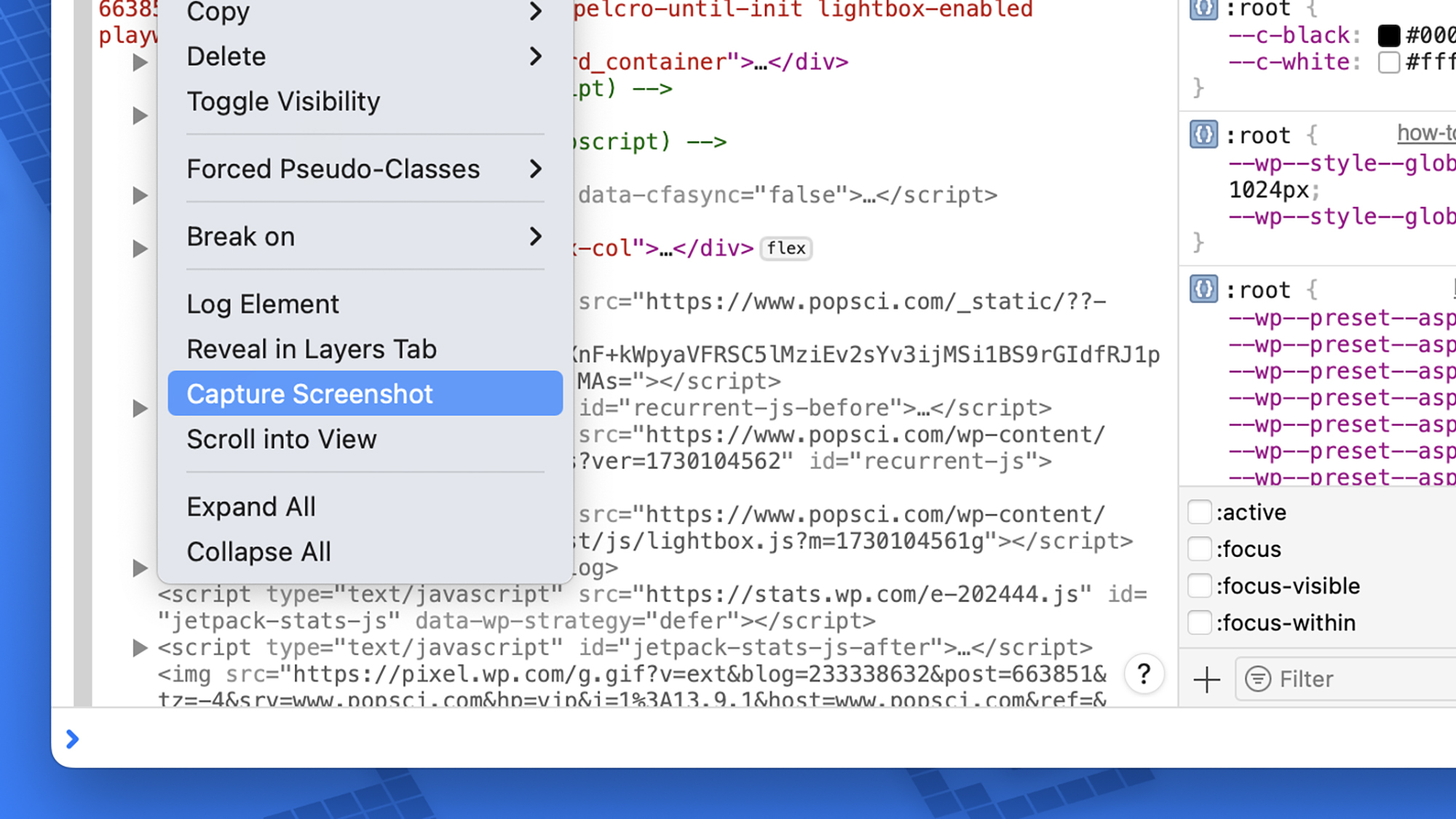 يحتوي Google Chrome لسطح المكتب على ميزة لقطة الشاشة المضمنة، ولكنها مخفية في أدوات مطور المتصفح. باستخدام الصفحة التي تريد التقاطها على الشاشة، اضغط علىالسيطرة + التحول + أنا(ويندوز) أوكمد + الخيار + أنا(macOS) لإظهار جزء أدوات المطور. من هناك: