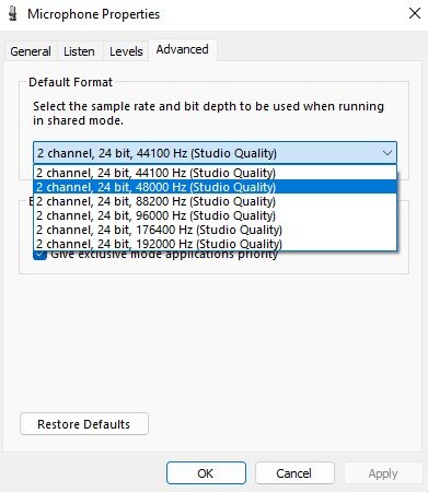 إذا كنت لا تسمع أي شيء، أو إذا كان الصوت غير صحيح، فتأكد من تغيير معدل العينة إلى 16 بت، 48,000 هرتز، في حالة توفر هذا الخيار لك. يمكن للتطبيقات الأخرى أيضًا أن تمنع جهاز الصوت الخاص بك من العمل بشكل صحيح. لمنع البرامج من تغيير تفضيلاتك الصوتية، تأكد من إلغاء تحديد المربعالسماح للتطبيقات بالتحكم الحصري في هذا الجهازالخيار وتطبيق التغييرات الخاصة بك.