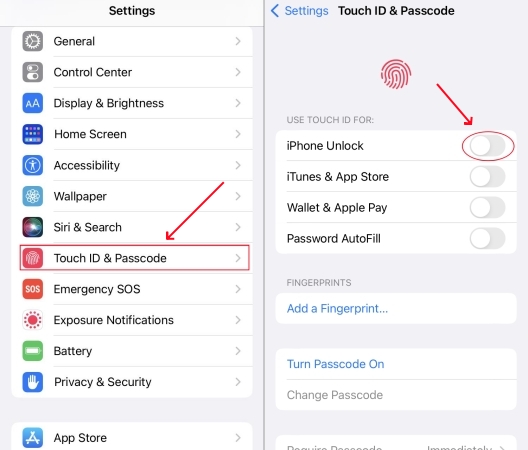 2.2 قم بإيقاف تشغيل Touch ID لفتح قفل iPhone/iPad