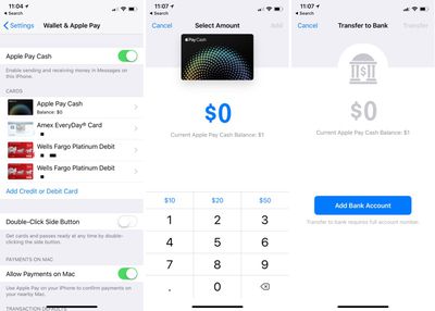 من خلال هذه الواجهة، يمكنك إضافة أموال إلى بطاقة Apple Cash الخاصة بك، وتحويل أموالك النقدية إلى البنك (الأمر الذي يتطلب إضافة حساب مصرفي) واختيار قبول المدفوعات تلقائيًا أو يدويًا.