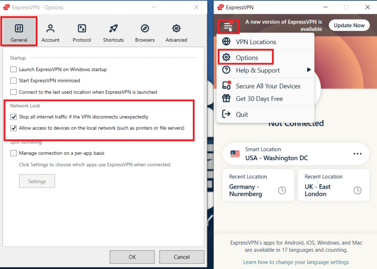 - قم بتمكين مفتاح إيقاف ExpressVPN. اذهب من خلالقائمة طعام>خيارات>عام>خانات الاختيار تحت“قفل الشبكة.”