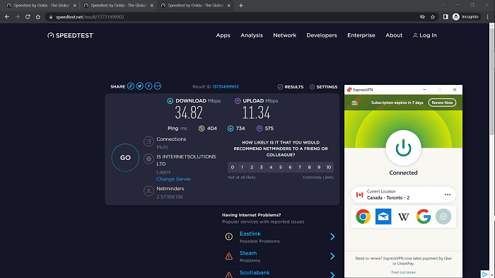 على سبيل المثال،بلغ متوسط سرعة خادم ExpressVPN حوالي 35 ميجابت في الثانية في اختبار شبكة بسرعة 45 ميجابت في الثانية، انخفاض الشبكة بنسبة 22٪ فقط. بالنظر إلى تحميل تشفير VPN، والذي عادةً ما يتسبب في انخفاض كبير في سرعة الاتصال، فإن أرقام ExpressVPN مثيرة للإعجاب.