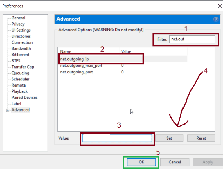 - مرة أخرى، ابحث عن "net.out"في مربع التصفية وانقر فوق"net.outgoing_ip.”