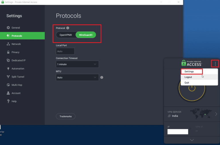 قال ذلك،يمكنك استخدام بروتوكولات OpenVPN أو WireGuard الخاصة بـ PIA مع BitTorrent. لكن،يعد بروتوكول PIA WireGuard هو الأفضل لـ BitTorrent لأنه يضمن سرعات تنزيل أسرع تحت تشفير VPN دون فقدان الأمان والخصوصية..