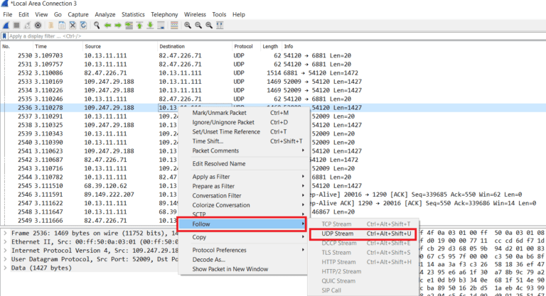 - انقر بزر الماوس الأيمن على أي إدخال لـ Wireshark، ثم حدديتبع>تيار UDP. لاحظ أن التدفق الذي ستتمكن من متابعته (TCP، HTTPS، وما إلى ذلك) يعتمد على النتيجة التي تنقر عليها.