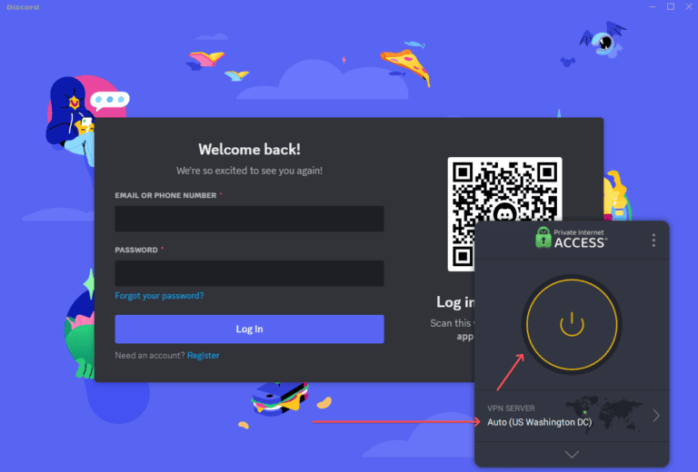 أفضل طريقة لاستخدام الوصول إلى الإنترنت الخاص مع Discord هيقم بتنزيل تطبيق VPN لجهازك المفضل,قم بتسجيل الدخول إلى حساب PIA الخاص بك، واتصل بخادم قريب قبل الوصول إلى Discord.