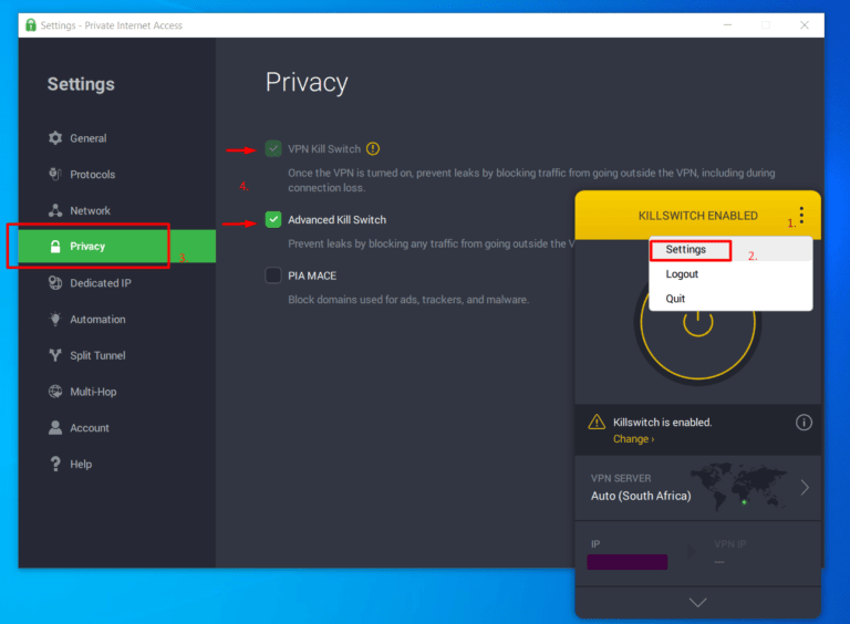 - انقرإعدادات>خصوصيةلتمكين "VPN اقتل التبديل.”وهذا يضمنالحماية المستمرة في حالة انقطاع اتصال خادم VPN عن طريق الخطأ (ضروري إذا كنت تريد تجنب هجمات DDoS أثناء لعب الألعاب السحابية الضعيفة مثل Minecraft).