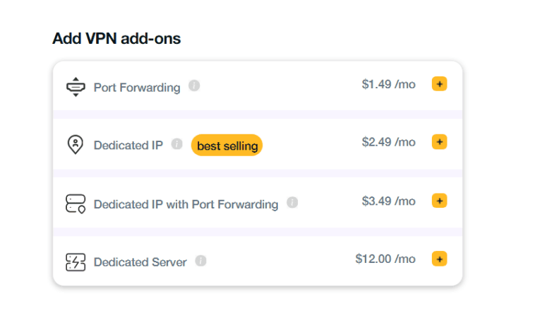 - انقر فوق "+"علامة بجانب"IP مخصص". يمكنك الحصول على توفير بنسبة 12% عن طريق اختيار حزمة Dedicated IP + Port Forwarding.