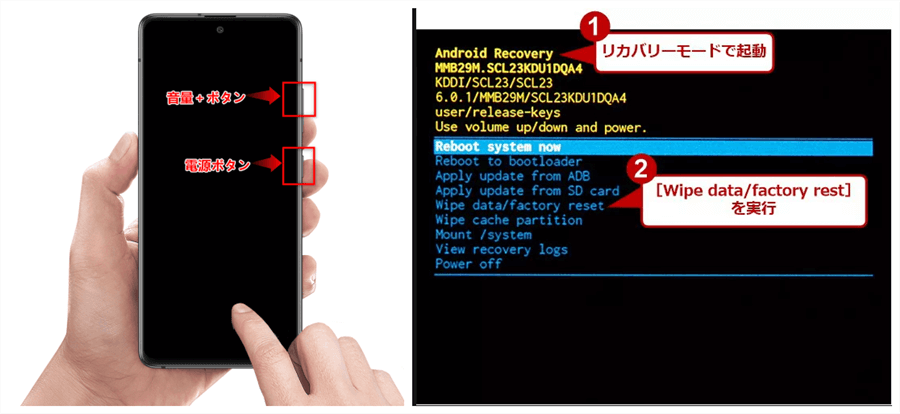 الخطوة 2: استخدم "زر رفع مستوى الصوت" و"زر خفض مستوى الصوت" للتمرير عبر الخيارات وتحديد عنصر "Wipe Data/Factory Reset"، ثم اضغط على زر الطاقة. الآن، تبدأ التهيئة.