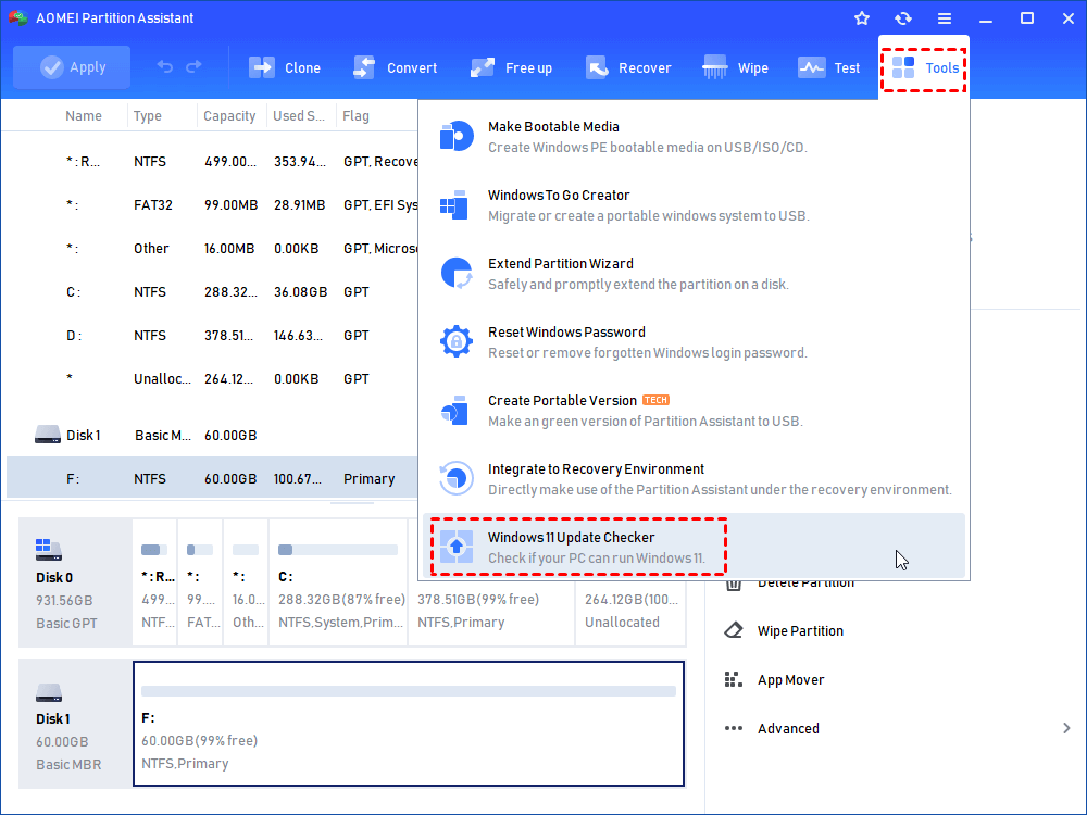 الخطوة 1: تثبيت وتشغيل IEMOA Partition Assistant Standard. على وحدة التحكم الرئيسية، انقر فوق "أدوات" وحدد "Windows 11 Update Checker".