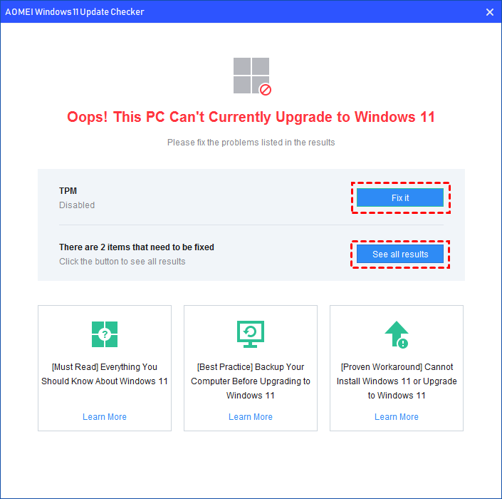 الخطوة 3: في غضون ثوان قليلة، سوف تتلقى النتائج. على عكس الأداة الموصى بها من Microsoft، يسمح لك IEMOA Windows 11 Update Checker بإصلاح أي مشكلات توافق على الفور تمنع جهاز الكمبيوتر الخاص بك من الترقية إلى Windows 11 بسبب قيود النظام.