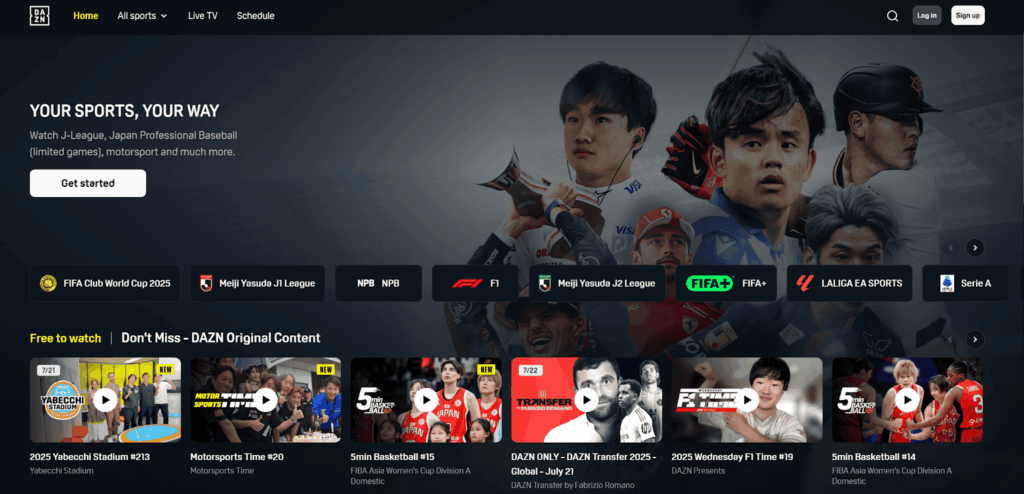التغطية الرياضية:تتخصص DAZN في تغطية الملاكمة والفنون القتالية المختلطة وكرة القدم، بما في ذلك الدوري الإنجليزي الممتاز ودوري أبطال أوروبا ودوري أبطال أوروبا للسيدات، إلى جانب كرة السلة والشطرنج والسهام والسنوكر والرياضات الخطرة.