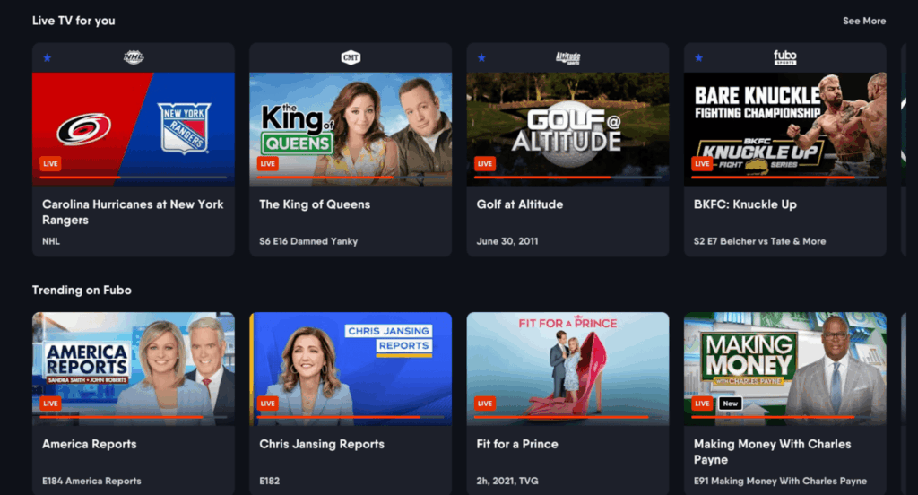 التغطية الرياضية:تقدم fuboTV تشكيلة القنوات الرياضية الأكثر شمولاً، بما في ذلك ESPN وFS1 وNBC Sports وCBS Sports وNFL Network والشبكات الرياضية الإقليمية لفرق MLB وNBA وNHL المحلية.
